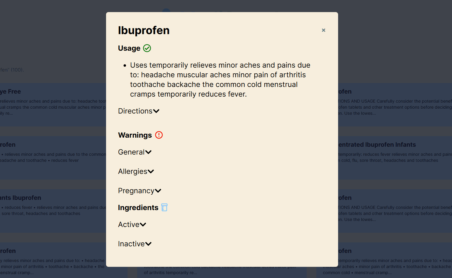 User can view details of the medication (ingredients, side effects, usage, warning, directions, allergies, pregnancy-related information