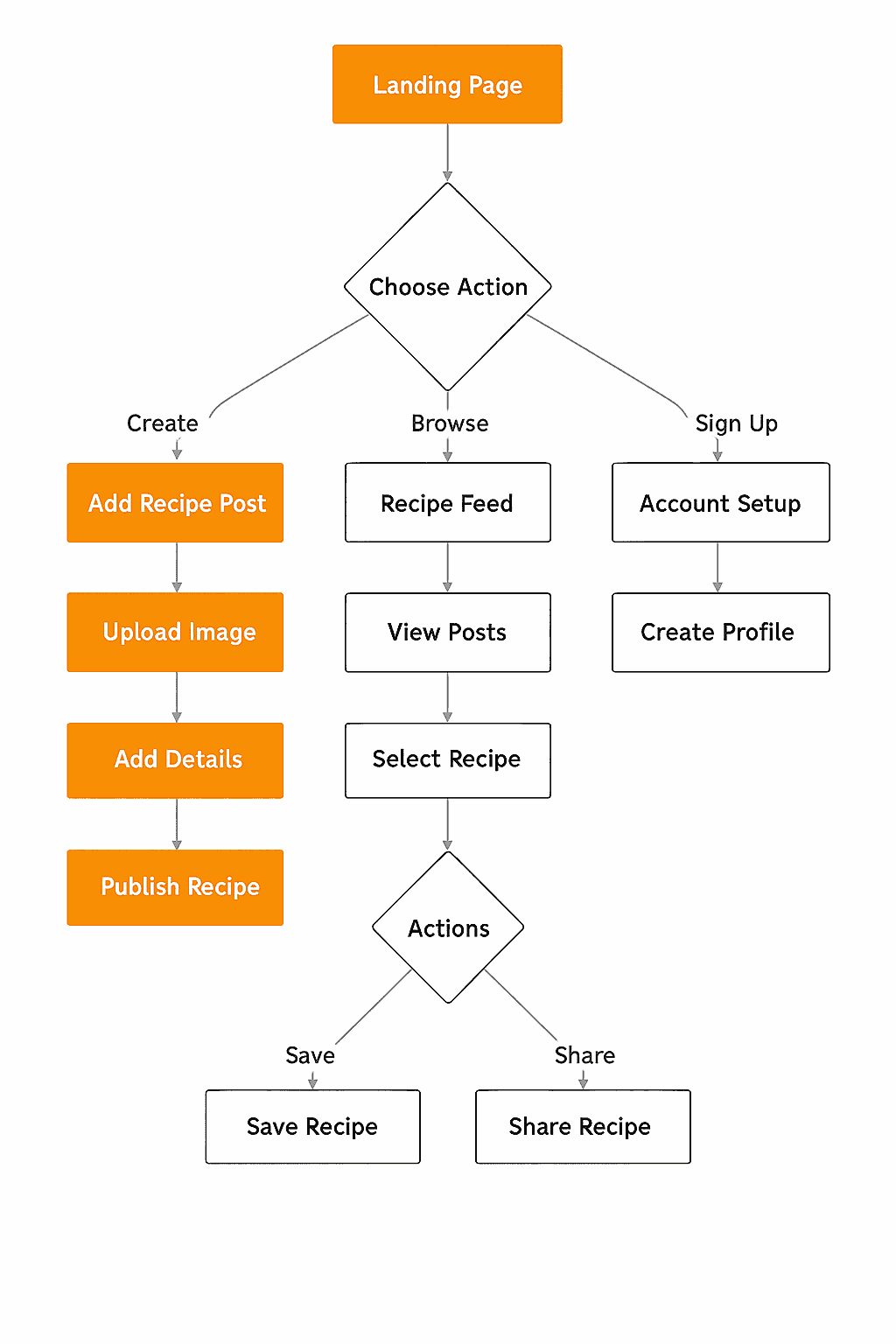 Actions → Users can Save Recipe for later or Share Recipe with others.